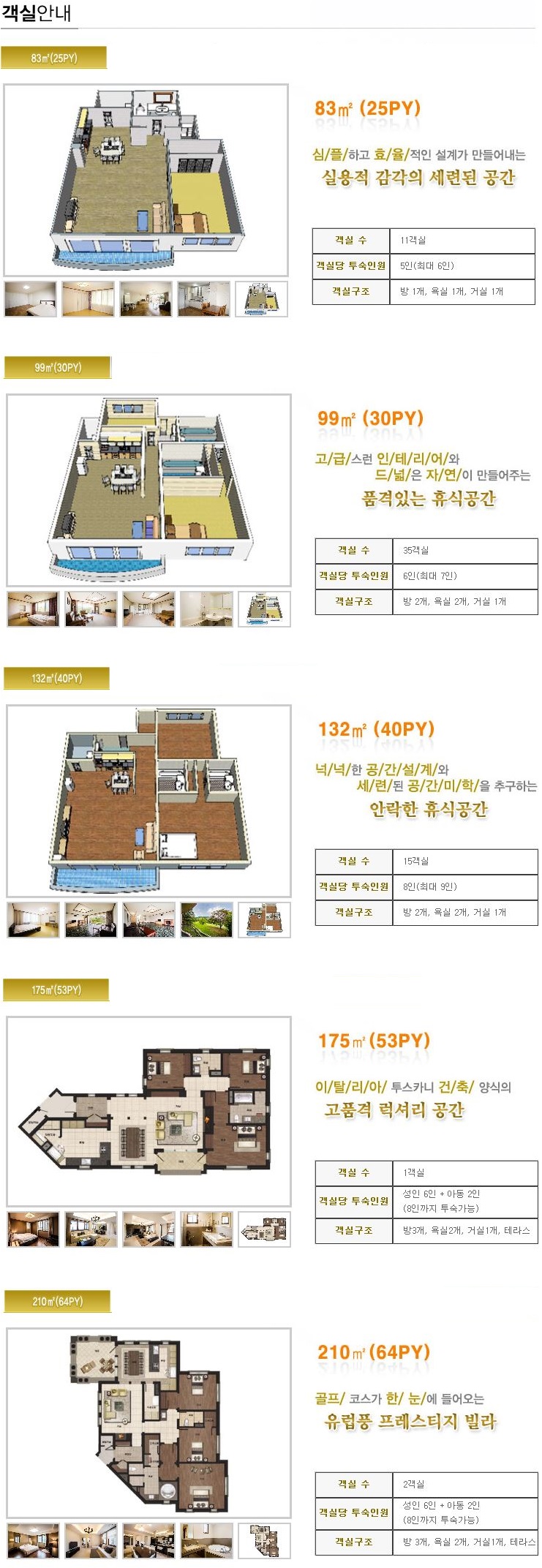 객실안내 : 25평형(18실), 30평형(60실), 40평형(22실)