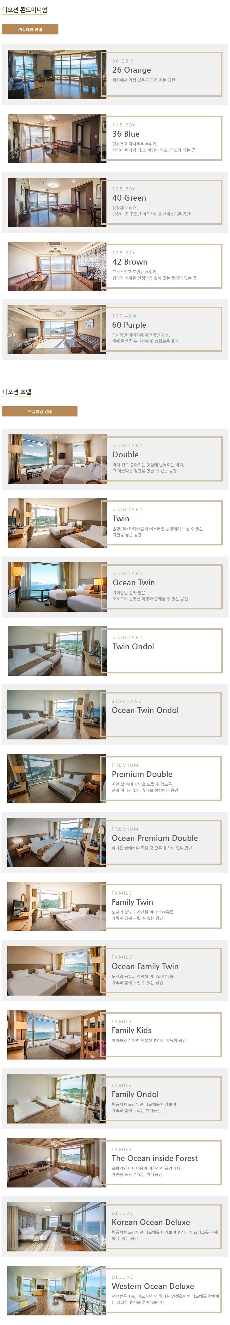객실안내 : 디오션 호텔(14개 타입 총 136객실), 디오션 콘도(5개 타입 총 128객실)