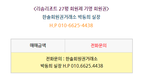 리솜리조트회원권 2021.09.09 시세 및 혜택안내 '리솜리조트'에서 '한솔회원권거래소' 작성함 리솜리조트회원권 2021.09.09 시세 및 혜택안내 안녕하세요. 한솔회원권거래소 박동희 실장입니다. 오늘은 리솜리조트회원권에 대해서 알아보도록 하겠습니다. 매매상담 - 한솔회원권거래소 박동희 실장 010.6625.4438 골프/콘도/휘트니스 회원권 한솔회원권거래소 빠른상담을 원하신다면 아래의 이미지를 클릭하여 주시기 바랍니다. ▼▼▼ 공유하기 게시글 관리 한솔콘도닷컴 저작자표시 (새창열림)