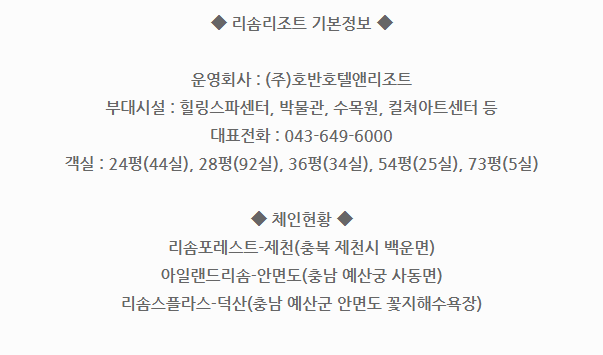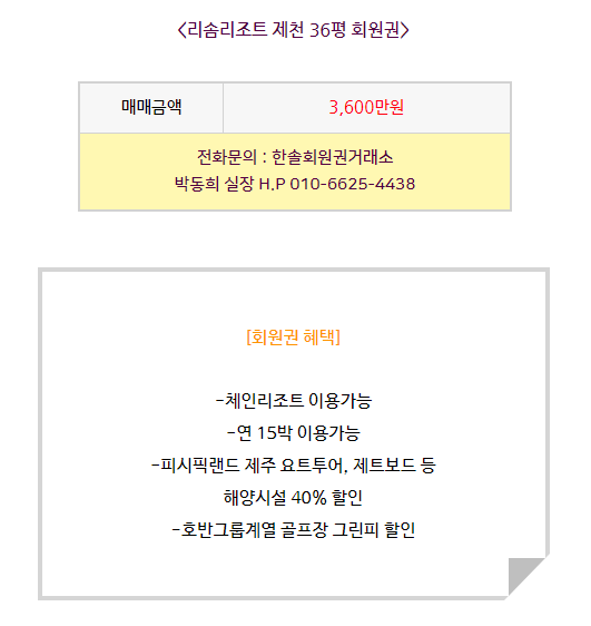 리솜리조트회원권 매매안내 '리솜리조트/제천'에서 '한솔회원권거래소' 작성함 리솜리조트회원권 매매안내 안녕하세요. 한솔회원권거래소 박동희 실장입니다. 오늘은 리솜리조트회원권에 대해서 알아보도록 하겠습니다. 매매상담 - 한솔회원권거래소 박동희 실장 010.6625.4438 리솜리조트 제천 오시는 길 골프/콘도/휘트니스 회원권 한솔회원권거래소 빠른상담을 원하신다면 아래의 이미지를 클릭하여 주시기 바랍니다. - 공유하기 게시글 관리 한솔콘도닷컴 저작자표시 (새창열림)