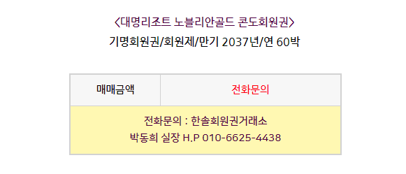 대명리조트 노블리안골드 회원권에 대한 정보! '대명리조트/노블리안'에서 '한솔회원권거래소' 작성함 대명리조트 노블리안골드 회원권에 대한 정보! 안녕하세요. 한솔회원권거래소 박동희 실장입니다. 오늘은 대명리조트 노블리안골드 콘도회원권에 대해서 알아보도록 하겠습니다. 매매상담 - 한솔회원권거래소 박동희 실장 010.6625.4438 대명리조트 체인현황 안내 골프/콘도/휘트니스 회원권 한솔회원권거래소 빠른상담을 원하신다면 아래의 이미지를 클릭하여 주시기 바랍니다. ▼▼▼ 공유하기 게시글 관리 한솔콘도닷컴 저작자표시 (새창열림)