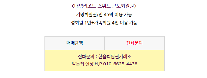 2021.10.19 대명리조트 스위트 콘도회원권 매매금액 안내 '대명리조트/스위트형'에서 '한솔회원권거래소' 작성함 2021.10.19 대명리조트 스위트 콘도회원권 매매금액 안내 안녕하세요. 한솔회원권거래소 박동희 실장입니다. 오늘은 대명리조트 스위트 콘도회원권에 대해서 알아보도록 하겠습니다. 매매상담 - 한솔회원권거래소 박동희 실장 010.6625.4438 골프/콘도/휘트니스 회원권 한솔회원권거래소 빠른상담을 원하신다면 아래의 이미지를 클릭하여 주시기 바랍니다. ▼▼▼ 공유하기 게시글 관리 한솔콘도닷컴 저작자표시 (새창열림)