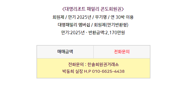 대명리조트패밀리회원권 시세 및 혜택안내 '대명리조트/패밀리형'에서 '한솔회원권거래소' 작성함 대명리조트패밀리회원권 시세 및 혜택안내 안녕하세요. 한솔회원권거래소 박동희 실장입니다. 오늘은 대명리조트패밀리콘도회원권에 대해 알아보도록 하겠습니다. 매매상담 - 한솔회원권거래소 박동희 실장 010.6625.4438 골프/콘도/휘트니스 회원권 한솔회원권거래소 빠른상담을 원하신다면 아래의 이미지를 클릭하여 주시기 바랍니다. ▼▼▼ 공유하기 게시글 관리 한솔콘도닷컴 저작자표시 (새창열림)