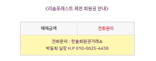 2021.10.25 리솜리조트 제천 포레스트회원권 매매안내 '리솜리조트/제천'에서 '한솔회원권거래소' 작성함 2021.10.25 리솜리조트 제천 포레스트회원권 매매안내 안녕하세요. 한솔회원권거래소 박동희 실장입니다. 오늘은 리솜리조트 제천 포레스트회원권에 대해서 알아보도록 하겠습니다. 매매상담 - 한솔회원권거래소 박동희 실장 010.6625.4438 제천 포레스트 오시는 길 골프/콘도/휘트니스 회원권 한솔회원권거래소 빠른상담을 원하신다면 아래의 이미지를 클릭하여 주시기 바랍니다. ▼▼▼ 공유하기 게시글 관리 한솔콘도닷컴 저작자표시 (새창열림)