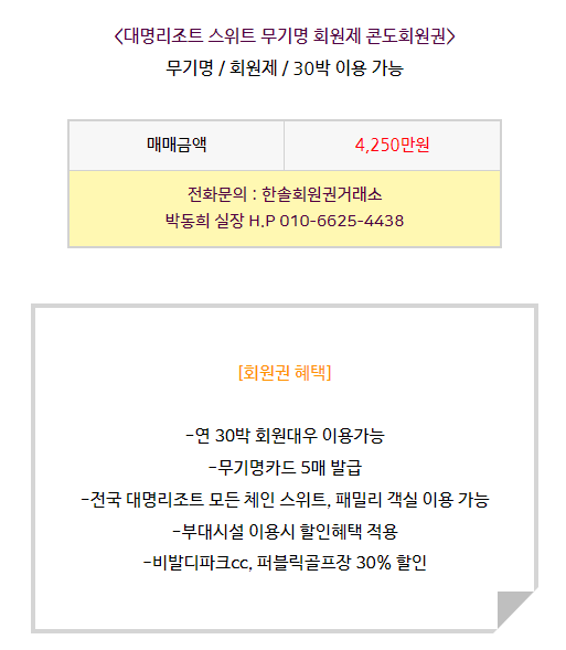 대명리조트 스위트 콘도회원권 매매안내 '대명리조트/스위트형'에서 '한솔회원권거래소' 작성함 대명리조트 스위트 콘도회원권 매매안내 안녕하세요. 한솔회원권거래소 박동희 실장입니다. 오늘은 대명리조트 스위트 콘도회원권에 대해서 알아보도록 하겠습니다. 매매상담 - 한솔회원권거래소 박동희 실장 010.6625.4438 골프/콘도/휘트니스 회원권 한솔회원권거래소 빠른상담을 원하신다면 아래의 이미지를 클릭하여 주시기 바랍니다. ▼▼▼ 공유하기 게시글 관리 한솔콘도닷컴 저작자표시 (새창열림)