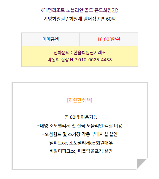 대명리조트 노블리안 골드회원권 매매안내 드립니다. '대명리조트/노블리안'에서 '한솔회원권거래소' 작성함 대명리조트 노블리안 골드회원권 매매안내 드립니다. 안녕하세요. 한솔회원권거래소 박동희 실장입니다. 오늘은 대명리조트 노블리안 골드 콘도회원권에 대해서 알아보도록 하겠습니다. 매매상담 - 한솔회원권거래소 박동희 실장 010.6625.4438 골프/콘도/휘트니스 회원권 한솔회원권거래소 빠른상담을 원하신다면 아래의 이미지를 클릭하여 주시기 바랍니다. ▼▼▼ 공유하기 게시글 관리 한솔콘도닷컴 저작자표시 (새창열림)
