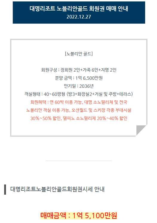 대명리조트노블리안골드회원권 매매 안내 '대명리조트/노블리안'에서 '한솔회원권거래소' 작성함 대명리조트노블리안골드회원권 매매 안내 안녕하세요. 한솔회원권거래소 입니다. 오늘은 대명노블리안골드회원권에 대해서 알아보도록 하겠습니다. 골프/콘도/휘트니스 회원권 한솔회원권거래소 빠른상담을 원하신다면 아래의 이미지를 클릭하여 주시기 바랍니다. ▼▼▼ 공유하기 게시글 관리 한솔콘도닷컴 저작자표시 (새창열림)