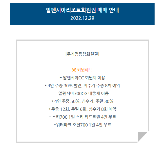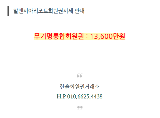 알펜시아리조트회원권 매매 안내 '알펜시아'에서 '한솔회원권거래소' 작성함 알펜시아리조트회원권 매매 안내 안녕하세요. 한솔회원권거래소 입니다. 오늘은 알펜시아리조트회원권에 대해서 알아보도록 하겠습니다. 골프/콘도/휘트니스 회원권 한솔회원권거래소 빠른상담을 원하신다면 아래의 이미지를 클릭하여 주시기 바랍니다. ▼▼▼ 공유하기 게시글 관리 한솔콘도닷컴 저작자표시 (새창열림)