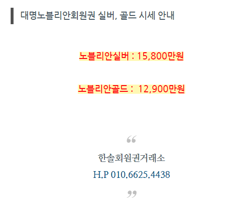 [대명노블리안무기명회원권] 노블리안 실버, 골드 / 기명,무기명 알아보기 '대명리조트/노블리안'에서 '한솔회원권거래소' 작성함 [대명노블리안무기명회원권] 노블리안 실버, 골드 / 기명,무기명 알아보기 안녕하세요. 골프, 콘도, 휘트니스 회원권까지 한눈에 알기쉽게 체크해드리고 있는 한솔회원권거래소 입니다! 오늘은 대명리조트노블리안회원권의 종류와 기명, 무기명의 차이점, 혜택 등에 대해서 알아보도록 하겠습니다. ✔✔✔ 위의 대명리조트회원권의 시세는 2023.08.14 (월) 오늘자 시세로 회원권의 시세는 상시 변동되기 때문에 정확한 매물체크를 원하시는 분들은 한솔회원권거래소로 많은 문의 부탁드립니다. 감사합니다^^🙏 ▼▼▼ 공유하기 게시글 관리 한솔콘도닷컴 저작자표시 (새창열림)