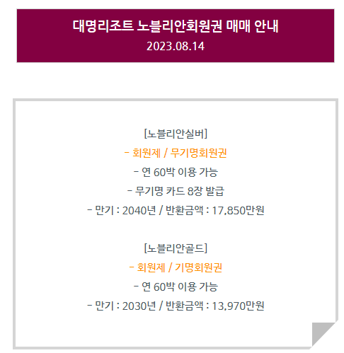 [대명노블리안무기명회원권] 노블리안 실버, 골드 / 기명,무기명 알아보기 '대명리조트/노블리안'에서 '한솔회원권거래소' 작성함 [대명노블리안무기명회원권] 노블리안 실버, 골드 / 기명,무기명 알아보기 안녕하세요. 골프, 콘도, 휘트니스 회원권까지 한눈에 알기쉽게 체크해드리고 있는 한솔회원권거래소 입니다! 오늘은 대명리조트노블리안회원권의 종류와 기명, 무기명의 차이점, 혜택 등에 대해서 알아보도록 하겠습니다. ✔✔✔ 위의 대명리조트회원권의 시세는 2023.08.14 (월) 오늘자 시세로 회원권의 시세는 상시 변동되기 때문에 정확한 매물체크를 원하시는 분들은 한솔회원권거래소로 많은 문의 부탁드립니다. 감사합니다^^🙏 ▼▼▼ 공유하기 게시글 관리 한솔콘도닷컴 저작자표시 (새창열림)
