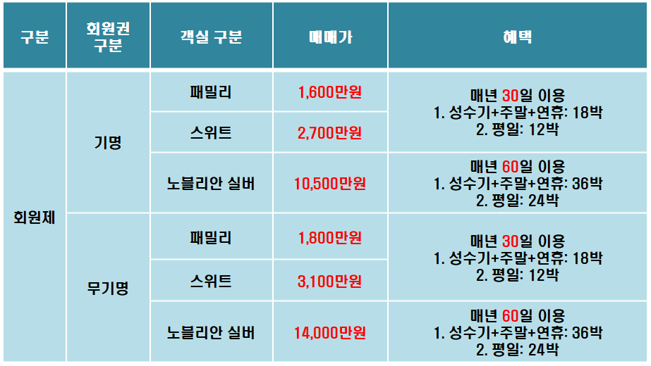 대명리조트는 평형별 패밀리, 스위트, 노블리안으로